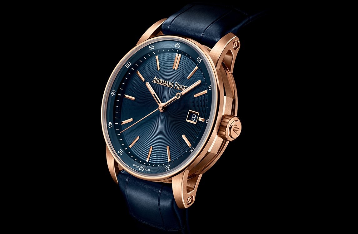 Bracelet | Pearly dark blue “large square scale” alligator strap with 18-carat pink gold pin buckle. |