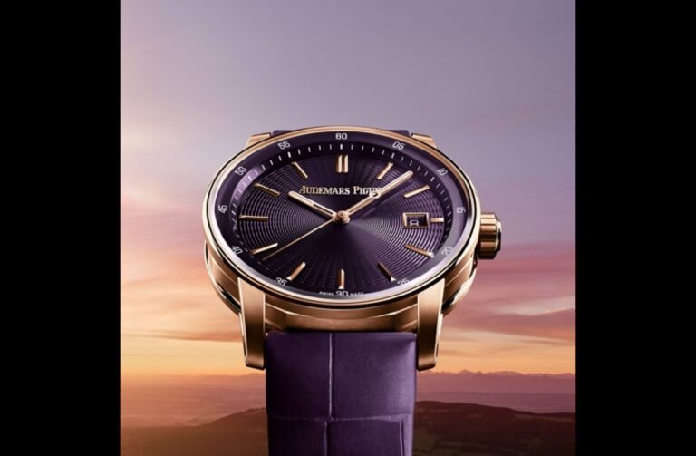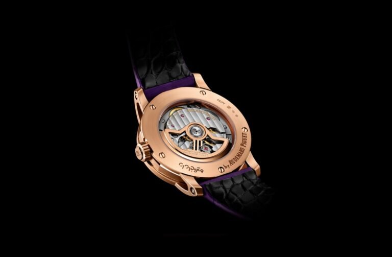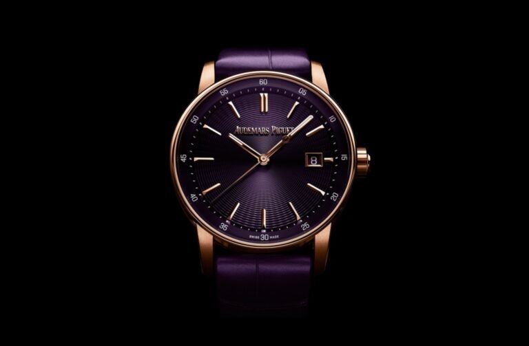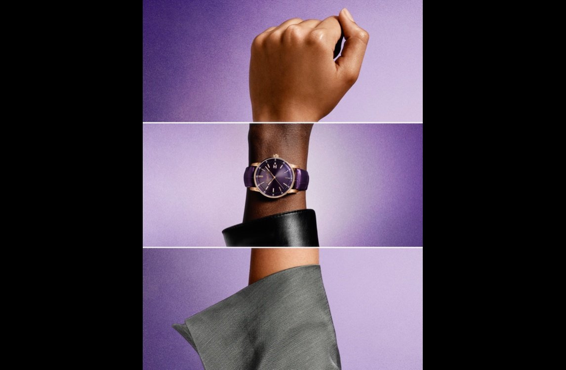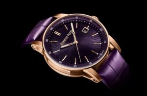 Dial | Purple dial, pink gold applied hour-markers and hands with luminescent coating, purple inner bezel. |
