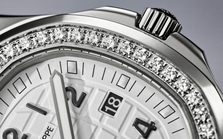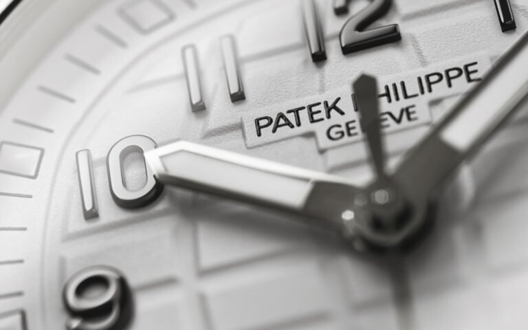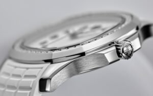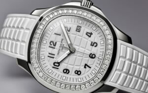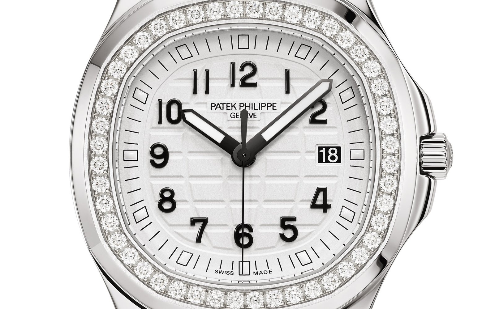 Matte white, embossed with Aquanaut pattern, blackened gold applied numerals