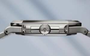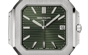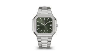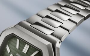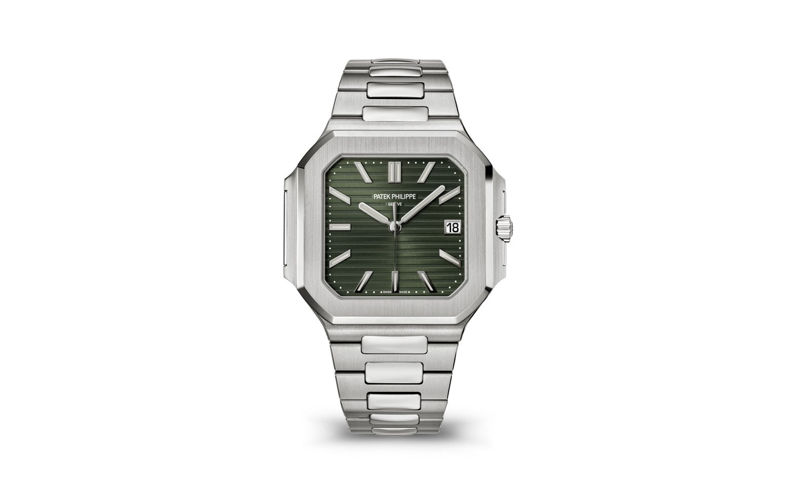 Dial | Sunburst olive green, horizontally embossed, white gold applied hour markers with white luminescent coating |