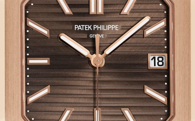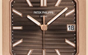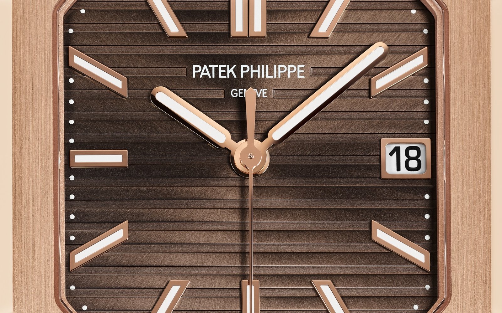 Sunburst brown, horizontally embossed, rose gold applied baton-style hour markers with white luminescent coating