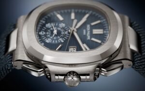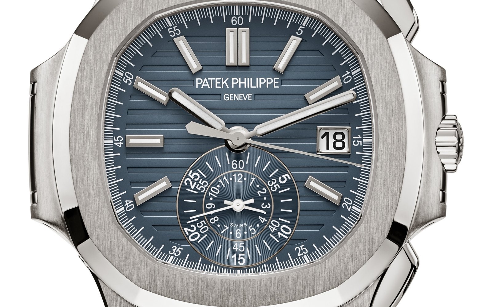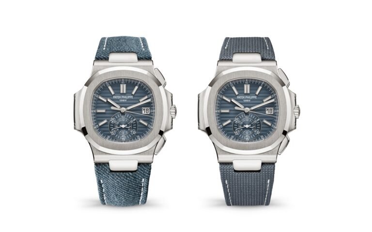 Calfskin, hand-stitched, denim pattern, blue-gray (originally fitted). Composite material, fabric pattern, blue-gray (additional strap). Nautilus fold-over clasp in white gold