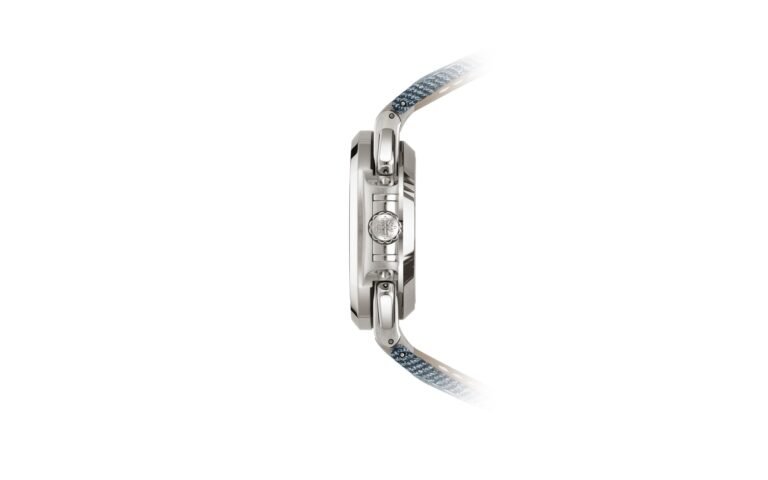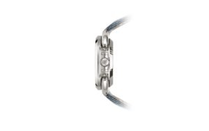 Opaline blue-gray, horizontally embossed, white gold applied hour markers with white luminescent coating
