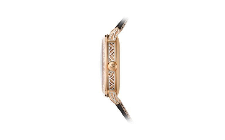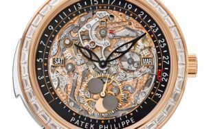 Transparent sapphire, date and minute markers printed in white with golden powdered dots