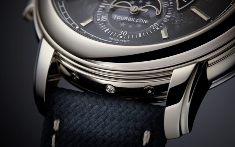 | Dial | Sapphire crystal with blue metallization and black-gradient rim, gold applied faceted obus hour markers |