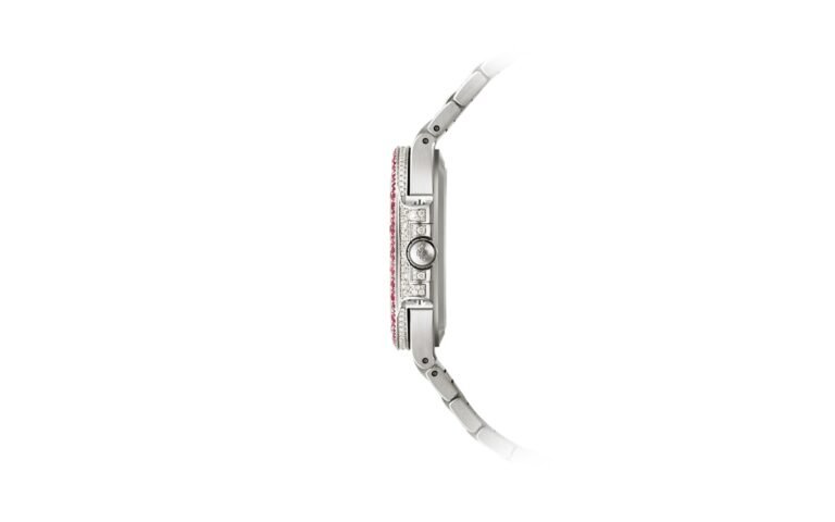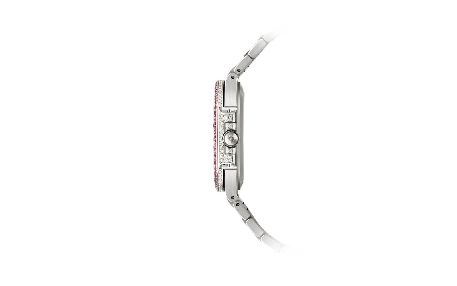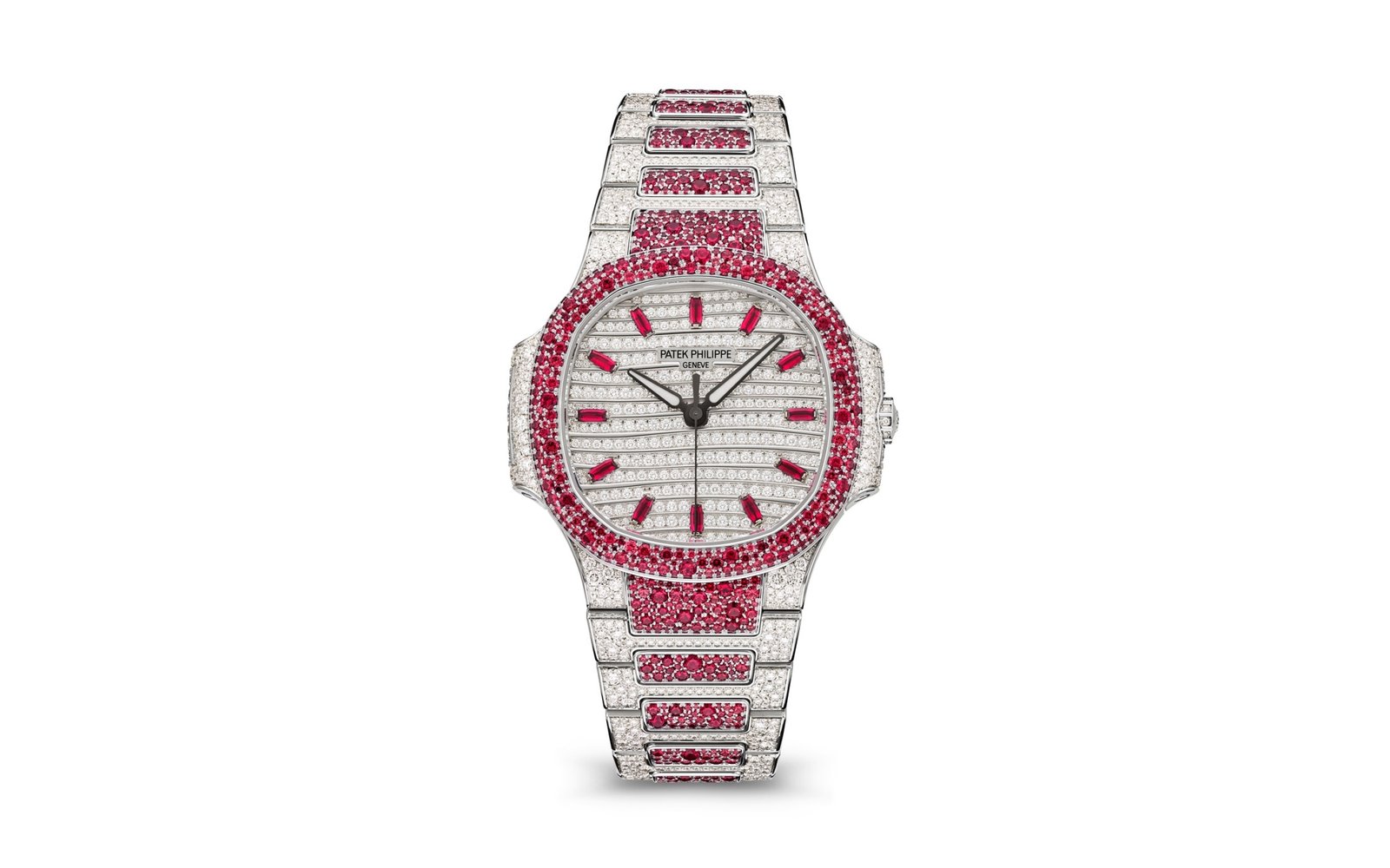 Fully paved with diamonds and rubies. 283 diamonds: 1.07 ct. (dial). 12 rubies: 0.37 ct. (hour markers). 241 diamonds: 1.08 ct. (case). 367 diamonds: 2.28 cts. (bezel). 976 diamonds: 4.38 cts. (bracelet). 497 rubies: 3.93 cts. (bracelet). Total of 1,500 diamonds (6.53 cts) and 876 rubies (6.58 cts)