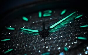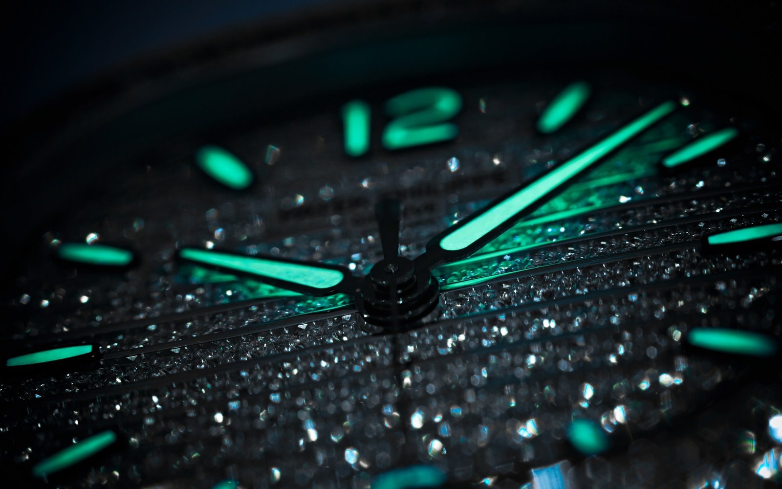 Dial | Paved with diamonds, blackened gold applied hour markers and numerals with luminescent coating. 18K gold dial plate |