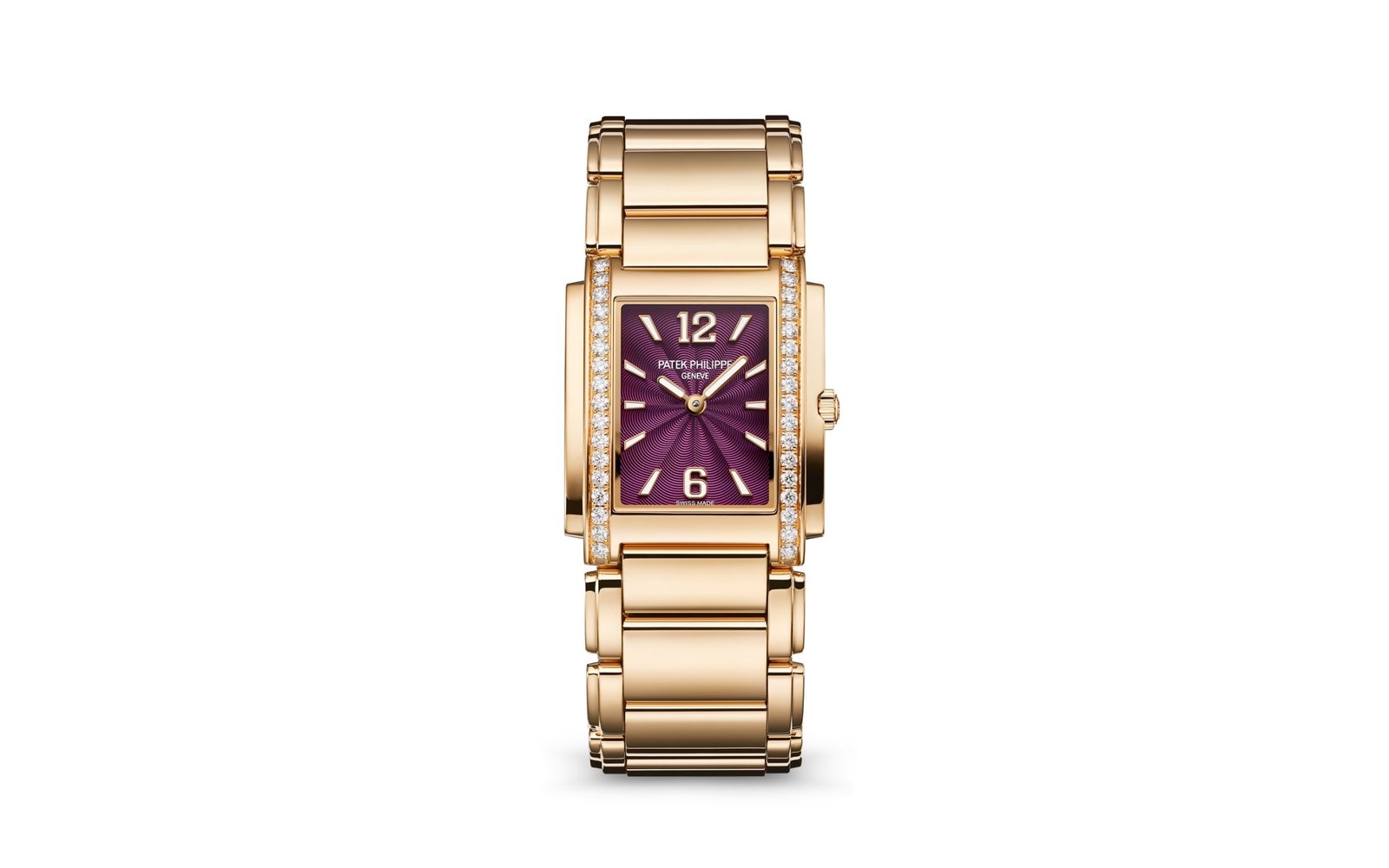 Embossed pattern and purple lacquered, rose gold applied hour markers and numerals with white luminescent coating