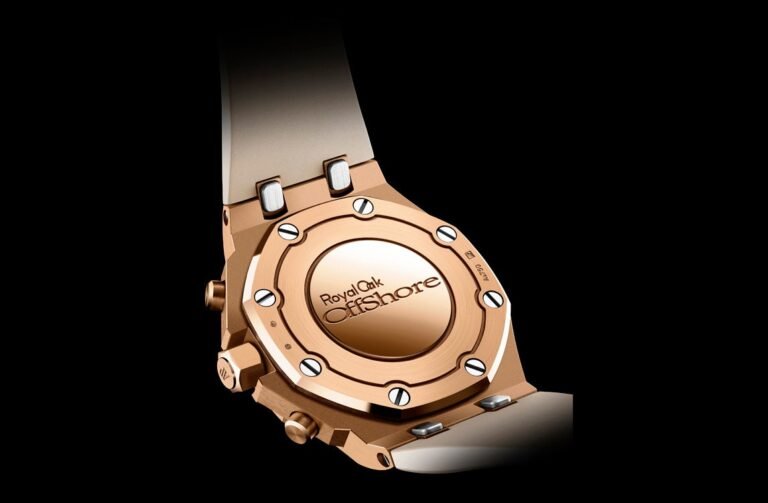 Dial | Light blue dial with “Lady Tapisserie” pattern, blue counters, pink gold applied hour-markers and Royal Oak hands with luminescent coating. |