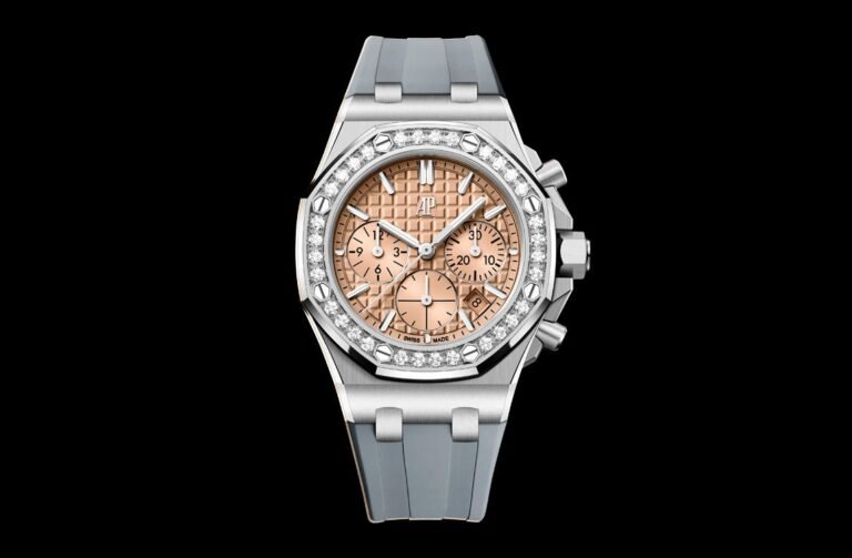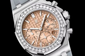 Dial | Salmon dial with “Lady Tapisserie” pattern, salmon counters, white gold applied hour-markers and Royal Oak hands with luminescent coating. |