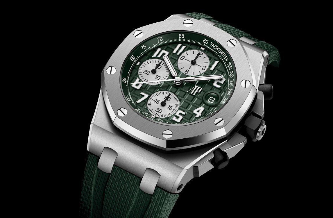 Dial | Khaki green dial with “Mega Tapisserie” pattern, silver-toned counters, arabic numerals hour-markers and white gold Royal Oak hands with luminescent coating, khaki green inner bezel. |